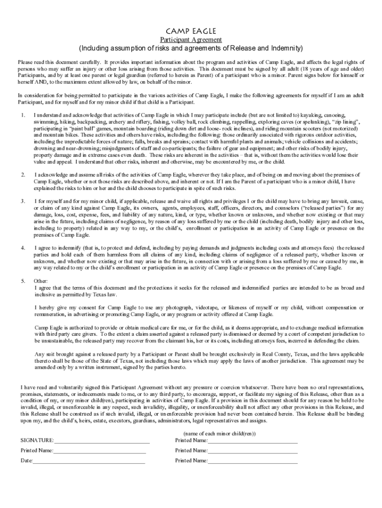 CAMP EAGLE Participant Agreement (Including assumption of risks and agreements of Release and Indemnity) Please read this document carefully. It provides important information about the program and