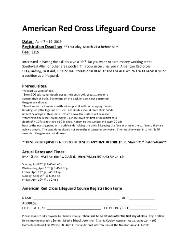 American Red Cross Lifeguard Course Dates: April 7 19, 2019 Registration Deadline: **Thursday, March 21st before 8am Fee: $215 Interested in having the skill to save a life? Do you want to earn money