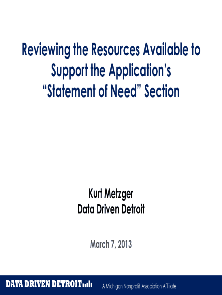 Reviewing the Resources Available to Support the Applications Statement of Need Section Kurt Metzger Data Driven Detroit March 7, 2013A Michigan Nonprofit Affiliate Affiliated with Association the