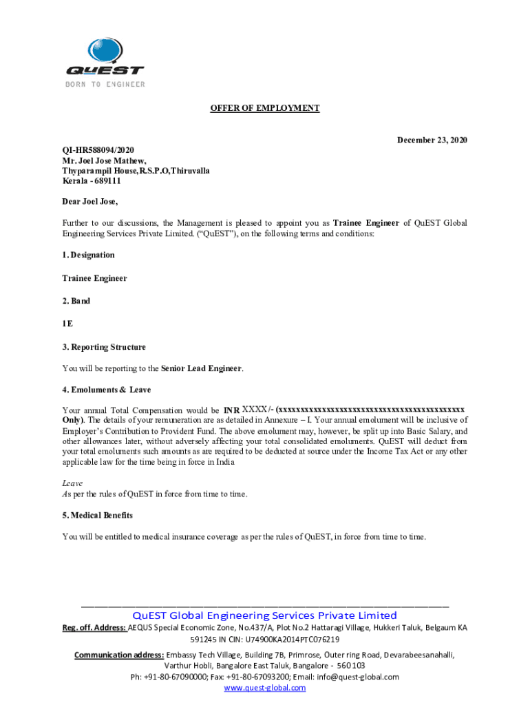 OFFER OF EMPLOYMENT December 23, 2020 QIHR588094/2020 Mr. Joel Jose Mathew, Thyparampil House, R.S.P.O, Thirlwall Kerala 689111 Dear Joel Jose, Further to our discussions, the Management is pleased