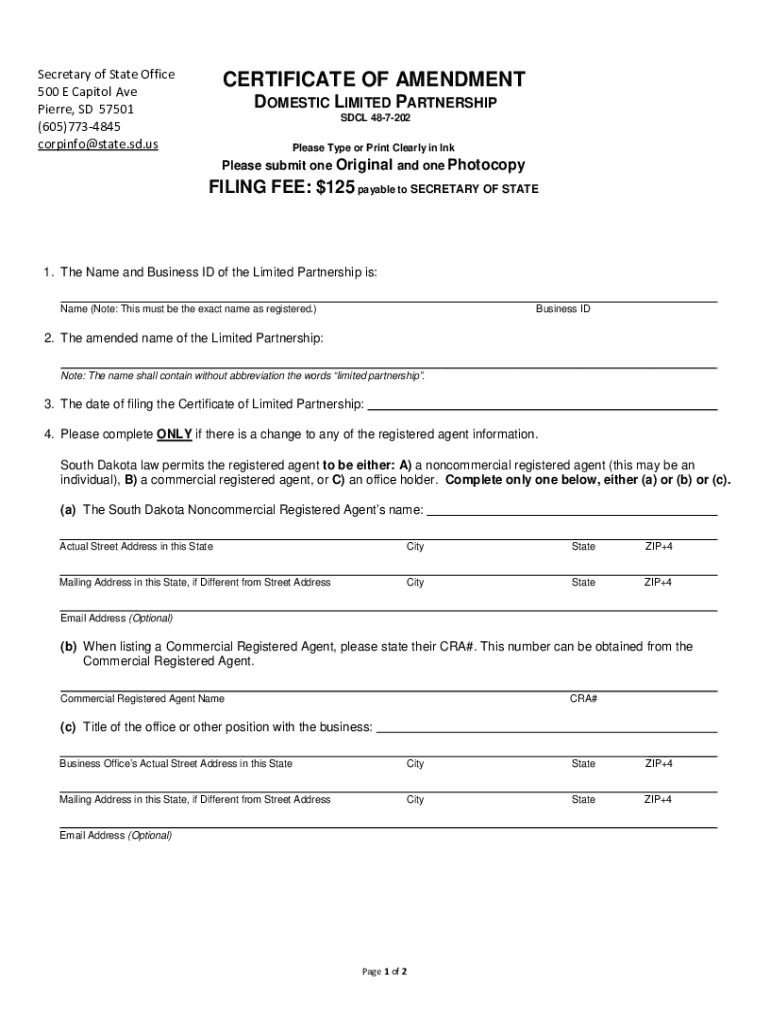Secretary of State Office 500 E Capitol Ave Pierre, SD 57501 (605)7734845 corpinfo@state.sd.usCERTIFICATE OF AMENDMENT DOMESTIC LIMITED PARTNERSHIPS DCL 487202 Please Type or Print Clearly in Increase