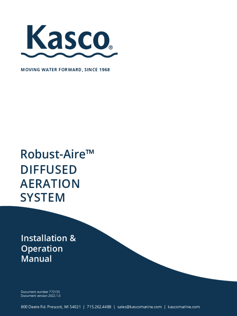 MOVING WATER FORWARD, SINCE 1968RobustAire DIFFUSED AERATION SYSTEM Installation & Operation ManualDocument number 772155 Document version 2022.1.0800 Deere Rd. Prescott, WI 54021 | 715.262.4488 |