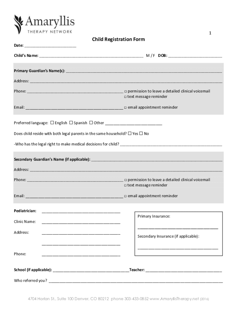 1Child Registration Form Date: ___ Child's Name: ___ M / F DOB: ___ Primary Guardians Name(s): ___ Address: ___ Phone: ___ permission to leave a detailed clinical voicemail text message reminder Email: