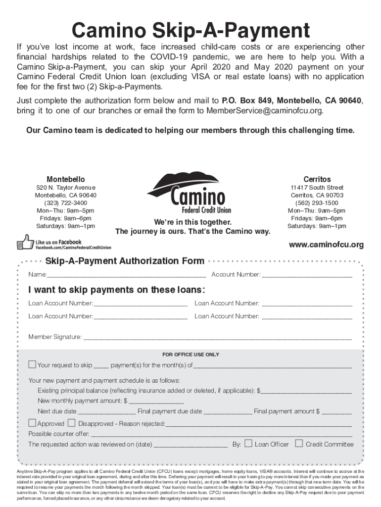 Camino SkipAPaymentIf you've lost income at work, face increased childcare costs or are experiencing other financial hardships related to the COVID-19 pandemic, we are here to help you. With a Camino