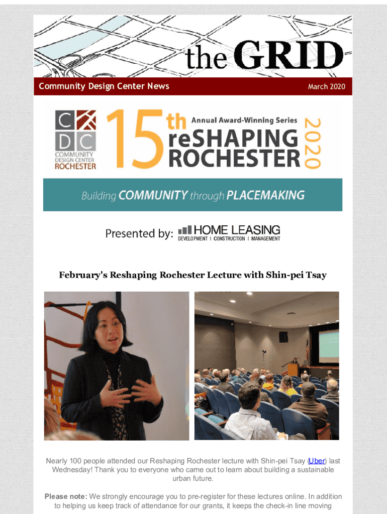 Community Design Center News March 2020February\'s Reshaping Rochester Lecture with Shipped TsayNearly 100 people attended our Reshaping Rochester lecture with Shipped Say (Uber) last Wednesday! Thank