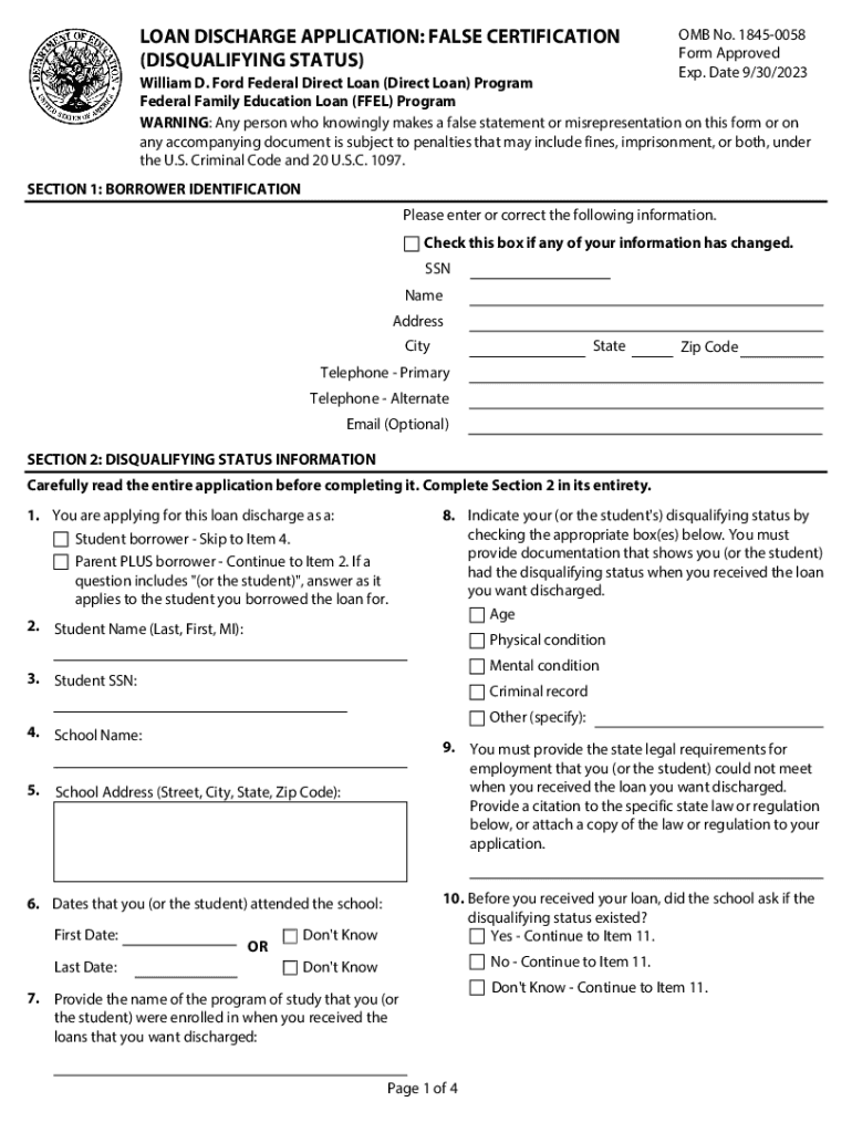 LOAN DISCHARGE APPLICATION: FALSE CERTIFICATION (DISQUALIFYING STATUS)OMB No. 18450058 Form Approved Exp. Date 9/30/2023William D. Ford Federal Direct Loan (Direct Loan) Program Federal Family Education