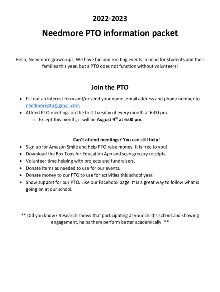20222023Needmore PTO information packet Hello, Need more grownups. We have fun and exciting events in mind for students and their families this year, but a PTO does not function without volunteers!