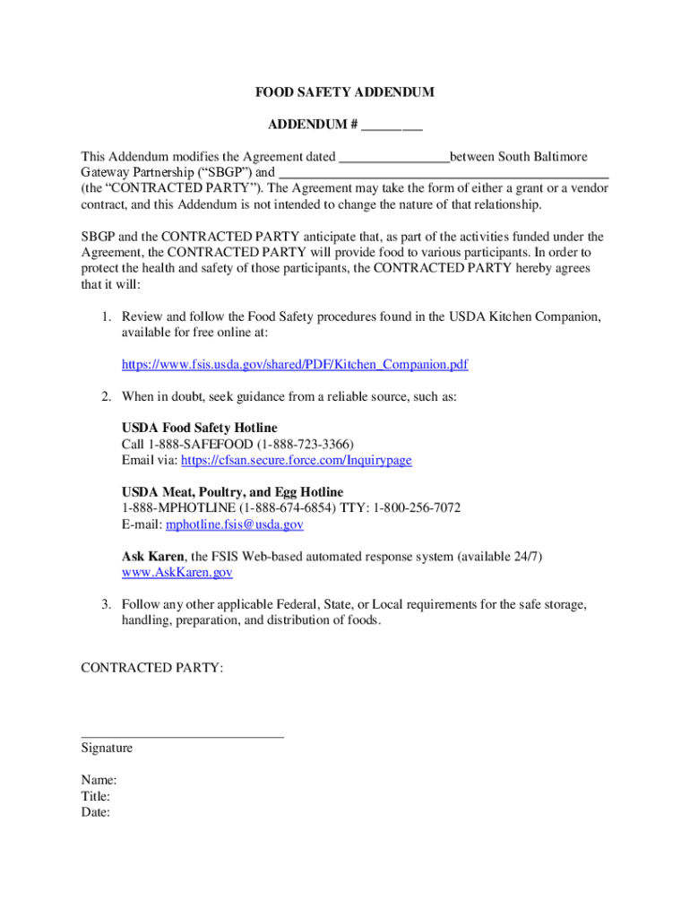 FOOD SAFETY ADDENDUM # ___ This Addendum modifies the Agreement dated between South Baltimore Gateway Partnership (SGP) and (the CONTRACTED PARTY). The Agreement may take the form of either a grant