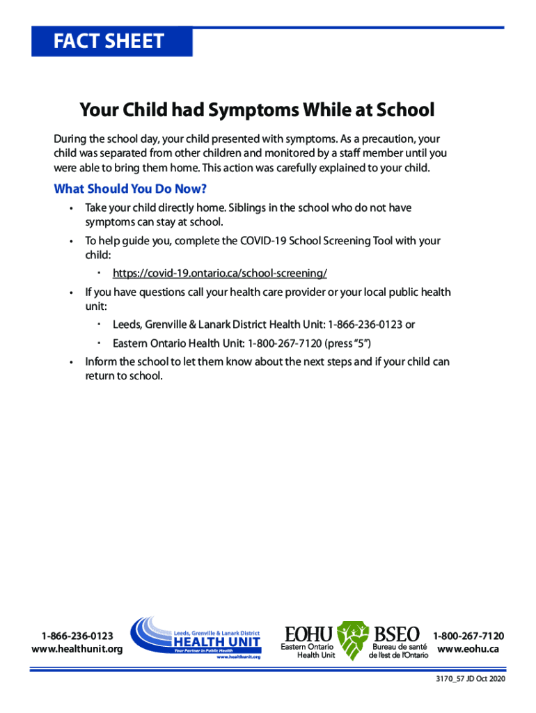 FACT SHEET Your Child had Symptoms While at School During the school day, your child presented with symptoms. As a precaution, your child was separated from other children and monitored by a staff