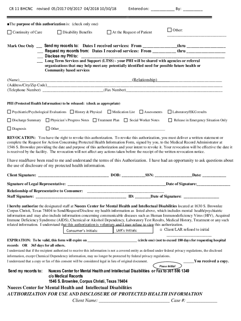 CR 11 BHC NC revised 05/2017 09/2017 04/2018 10/30/18Entered on: ___ By: ___The purpose of this authorization is: (check only one) Continuity of Creditability BenefitsOther: ___At the Request of Patient