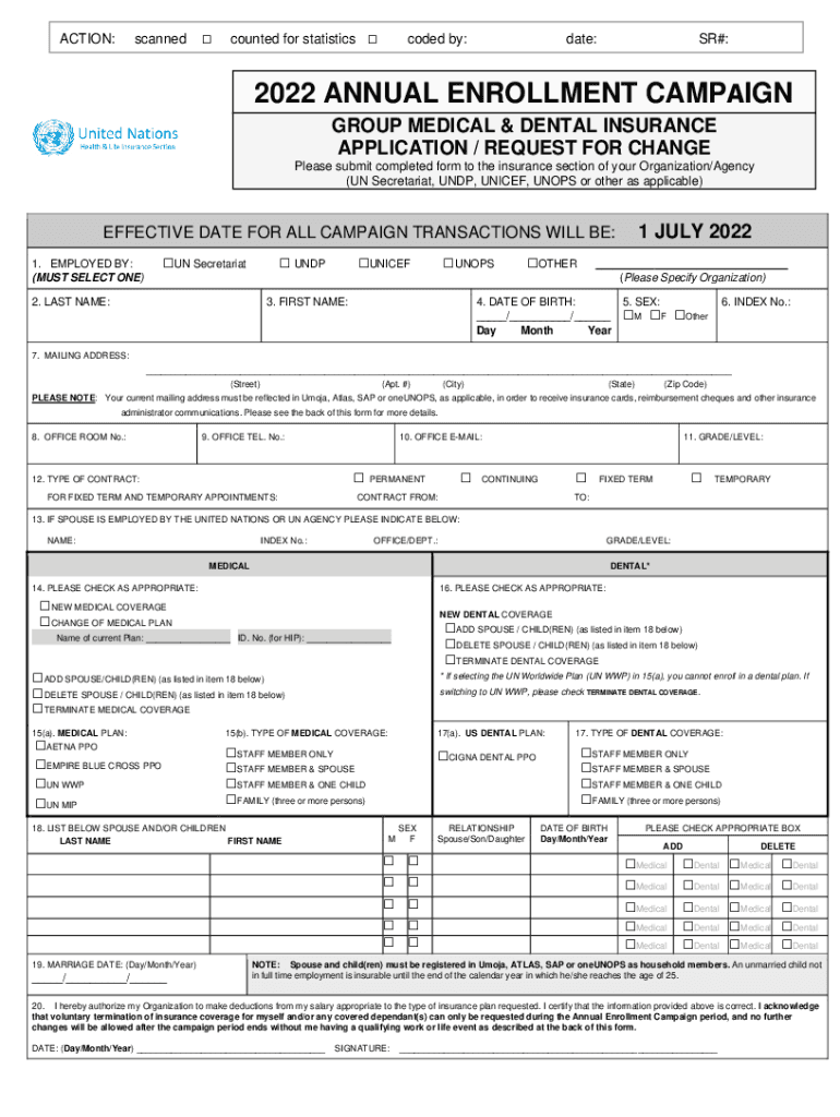 ACTION:scanned counted for statistics coded by:date:SR#:2022 ANNUAL ENROLLMENT CAMPAIGN GROUP MEDICAL & DENTAL INSURANCE APPLICATION / REQUEST FOR CHANGE Please submit completed form to the insurance