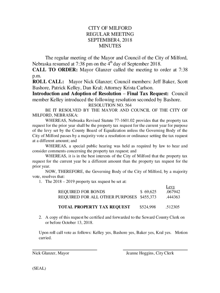 CITY OF MILFORD REGULAR MEETING SEPTEMBER4, 2018 MINUTES The regular meeting of the Mayor and Council of the City of Milford, Nebraska resumed at 7:38 pm on the 4th day of September 2018. CALL TO
