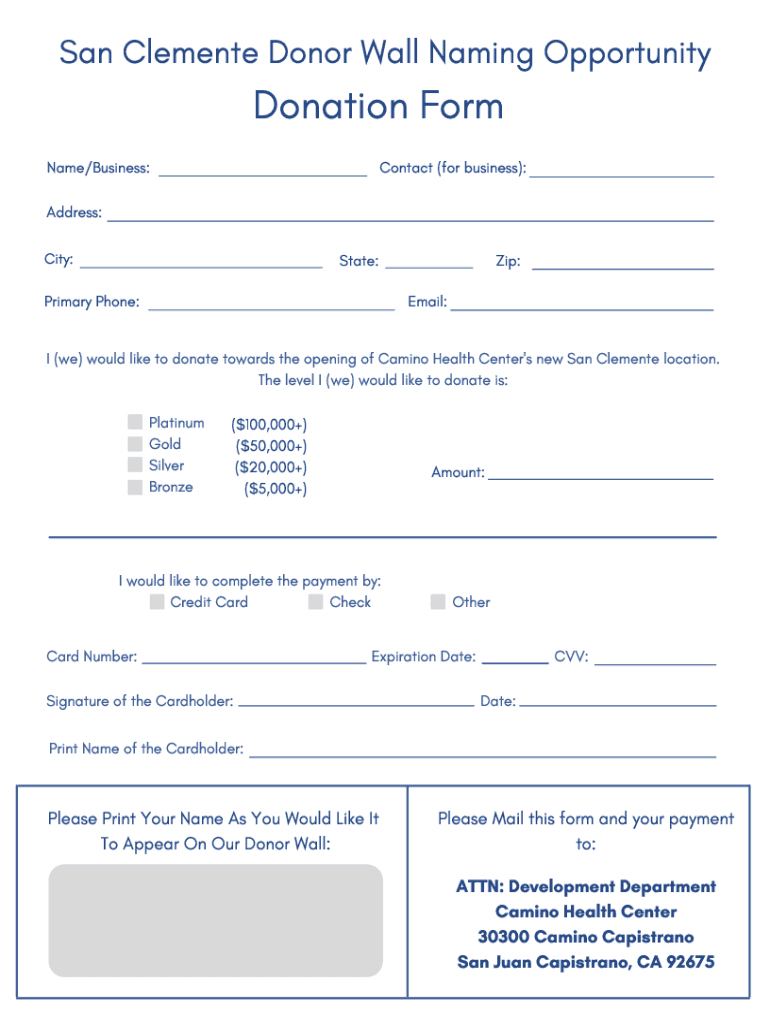 San Clemente Donor Wall Naming OpportunityDonation Form Name/Business:Contact (for business):Address:City:State:Primary Phone:Zip:Email:I (we) would like to donate towards the opening of Camino Health