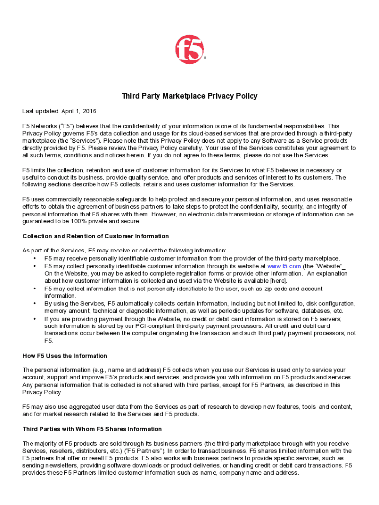 Third Party Marketplace Privacy Policy Last updated: April 1, 2016 F5 Networks (F5) believes that the confidentiality of your information is one of its fundamental responsibilities. This Privacy Policy