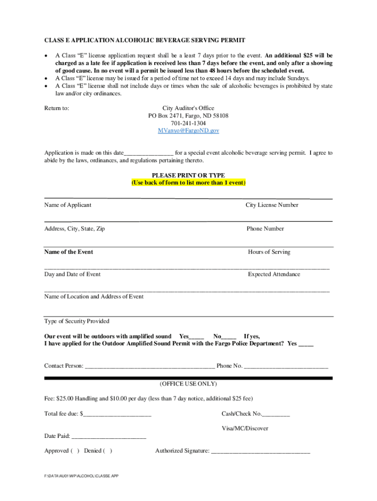 CLASS E APPLICATION ALCOHOLIC BEVERAGE SERVING PERMIT A Class E license application request shall be the least 7 days prior to the event. An additional $25 will be charged as a late fee if application