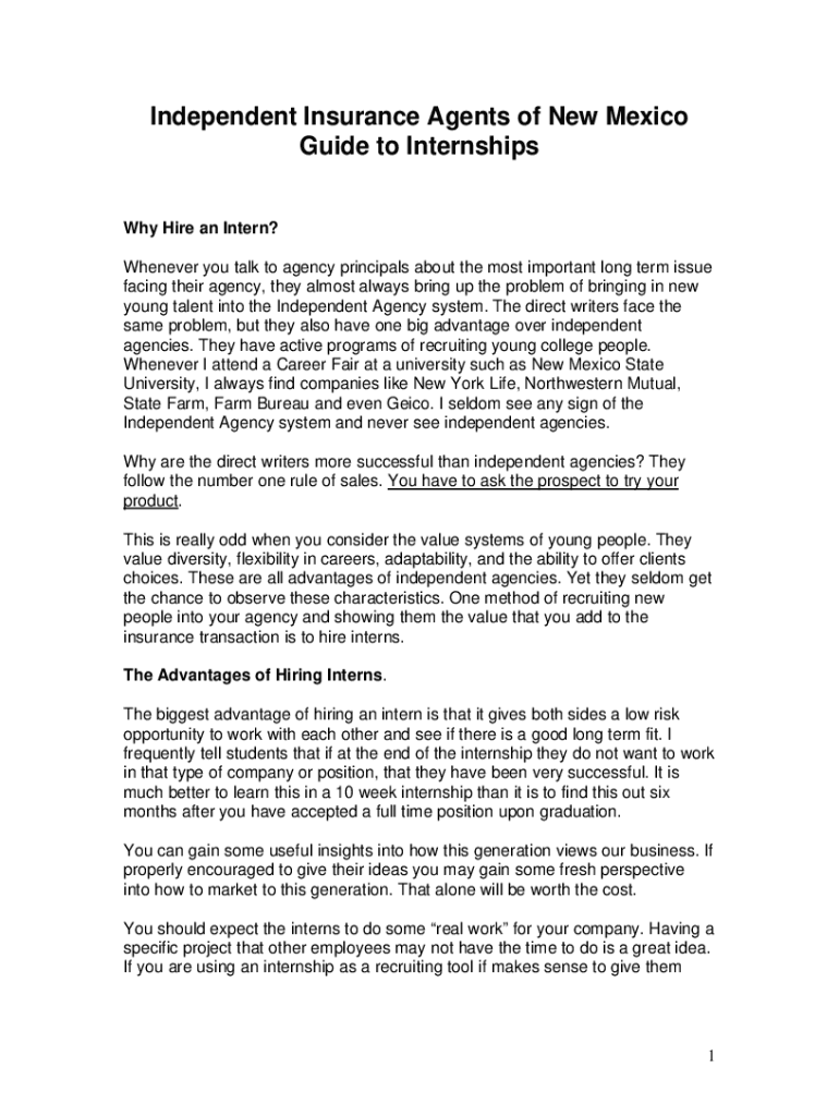 Independent Insurance Agents of New Mexico Guide to Internships Why Hire an Intern? Whenever you talk to agency principals about the most important long term issue facing their agency, they almost