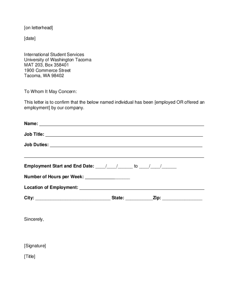 [on letterhead] [date]International Student Services University of Washington Tacoma MAT 203, Box 358401 1900 Commerce Street Tacoma, WA 98402To Whom It May Concern: This letter is to confirm that