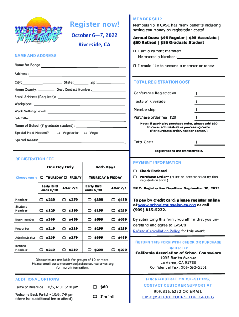 Register now! October 67, 2022 Riverside, MEMBERSHIP in CASE has many benefits including saving you money on registration costs! Annual Dues: $95 Regular | $95 Associate | $60 Retired | $55 Graduate