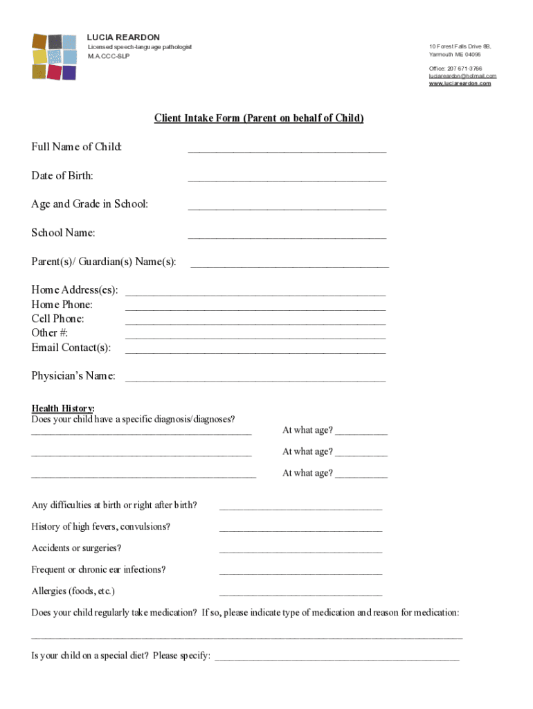 LUCIA REAR DON 10 Forest Falls Drive 8B, Yarmouth ME 04096Licensed speech language pathologist. A.CCCSLPOffice: 207 6713766 luciareardon@hotmail.com www.luciareardon.com! Client Intake Form (Parent