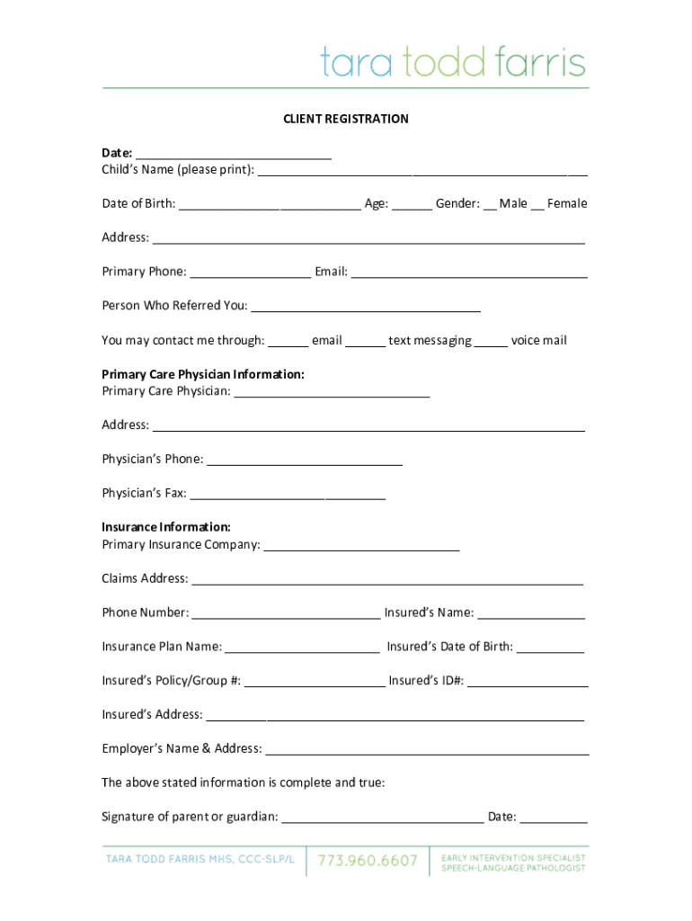 CLIENT REGISTRATION Date: ___ Child's Name (please print): ___ Date of Birth: ___ Age: ___ Gender: __ Male __ Female Address: ___ Primary Phone: ___ Email: ___ Person Who Referred You: ___ You may