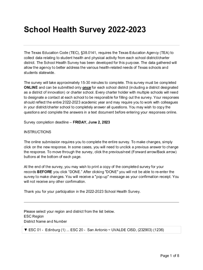 School Health Survey 20222023 The Texas Education Code (TEC), 38.0141, requires the Texas Education Agency (TEA) to collect data relating to student health and physical activity from each school district/charter