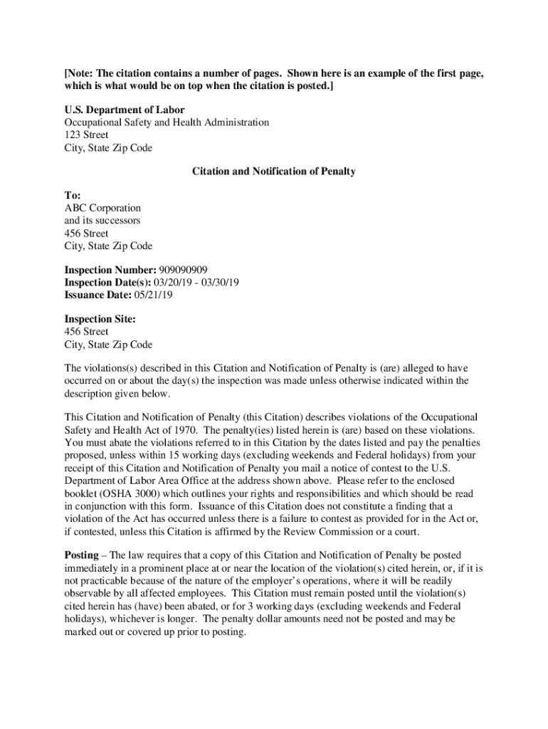[Note: The citation contains a number of pages. Shown here is an example of the first page, which is what would be on top when the citation is posted.] U.S. Department of Labor Occupational Safety