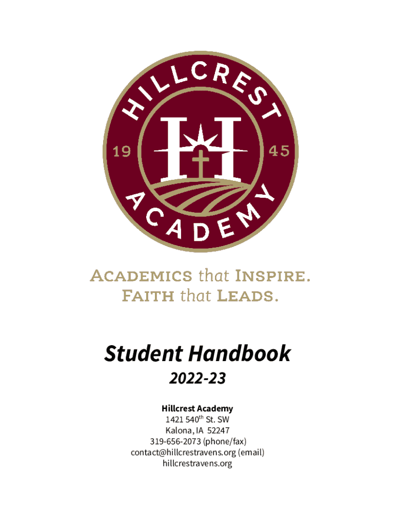 Student Handbook 202223Hillcrest Academy 1421 540th St. SW Baloney, IA 52247 3196562073 (phone/fax) contact@hillcrestravens.org (email) hillcrestravens. Portable of Contents Page 2: Page 3:Page 4: