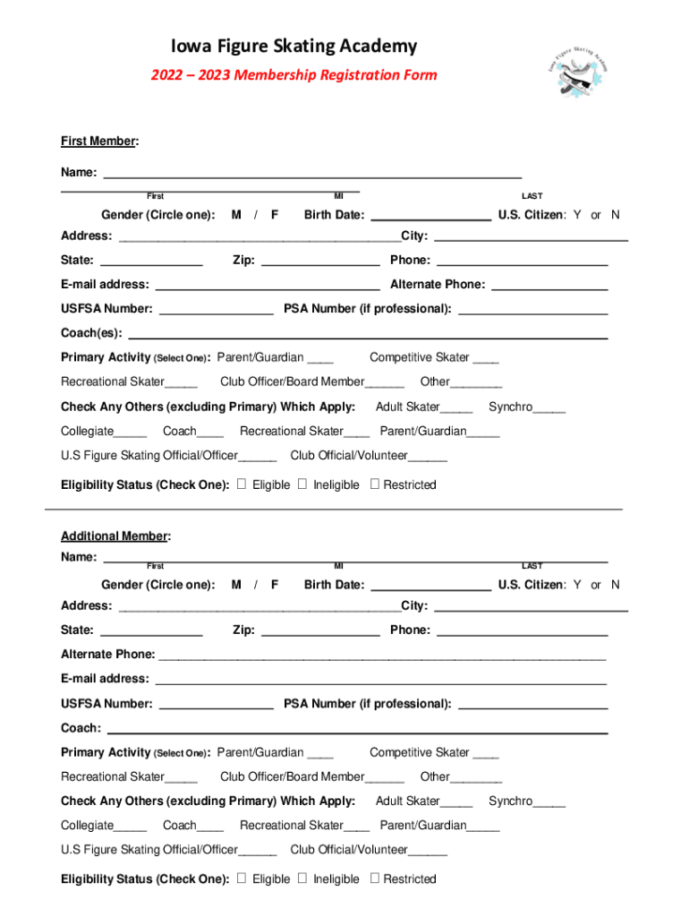 Iowa Figure Skating Academy 2022 2023 Membership Registration Formalist Member: Name: FirstMIGender (Circle one):M/FLASTBirth Date:U.S. Citizen: Y or Address: ___City: State:Zip:Phone:Email address:Alternate