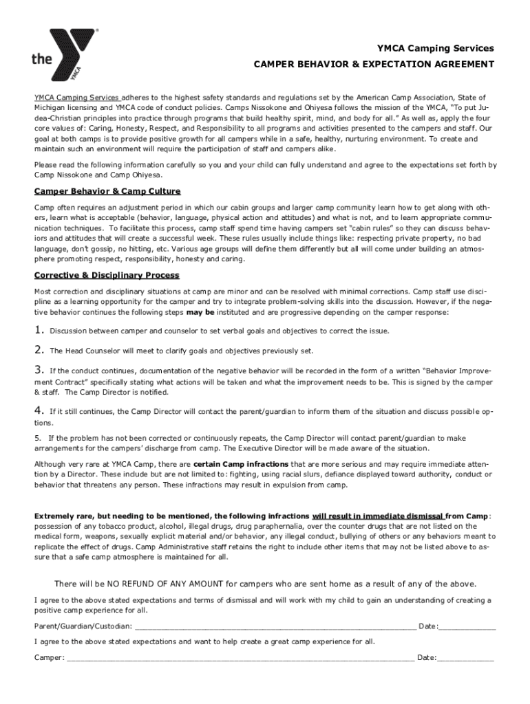YMCA Camping Services CAMPER BEHAVIOR & EXPECTATION AGREEMENT YMCA Camping Services adheres to the highest safety standards and regulations set by the American Camp Association, State of Michigan