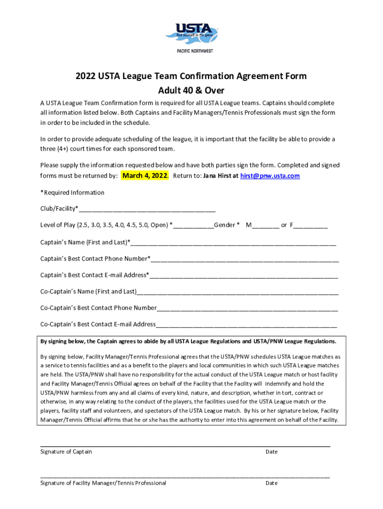 2022 USTA League Team Confirmation Agreement Form Adult 40 & Over A USTA League Team Confirmation form is required for all USTA League teams. Captains should complete all information listed below.