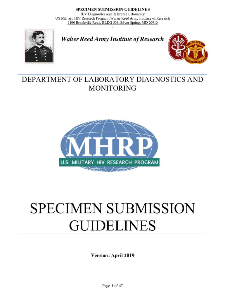 SPECIMEN SUBMISSION GUIDELINES HIV Diagnostics and Reference Laboratory US Military HIV Research Program, Walter Reed Army Institute of Research 9100 Brookville Road, BLDG 508, Silver Spring, MD 20910`Walter