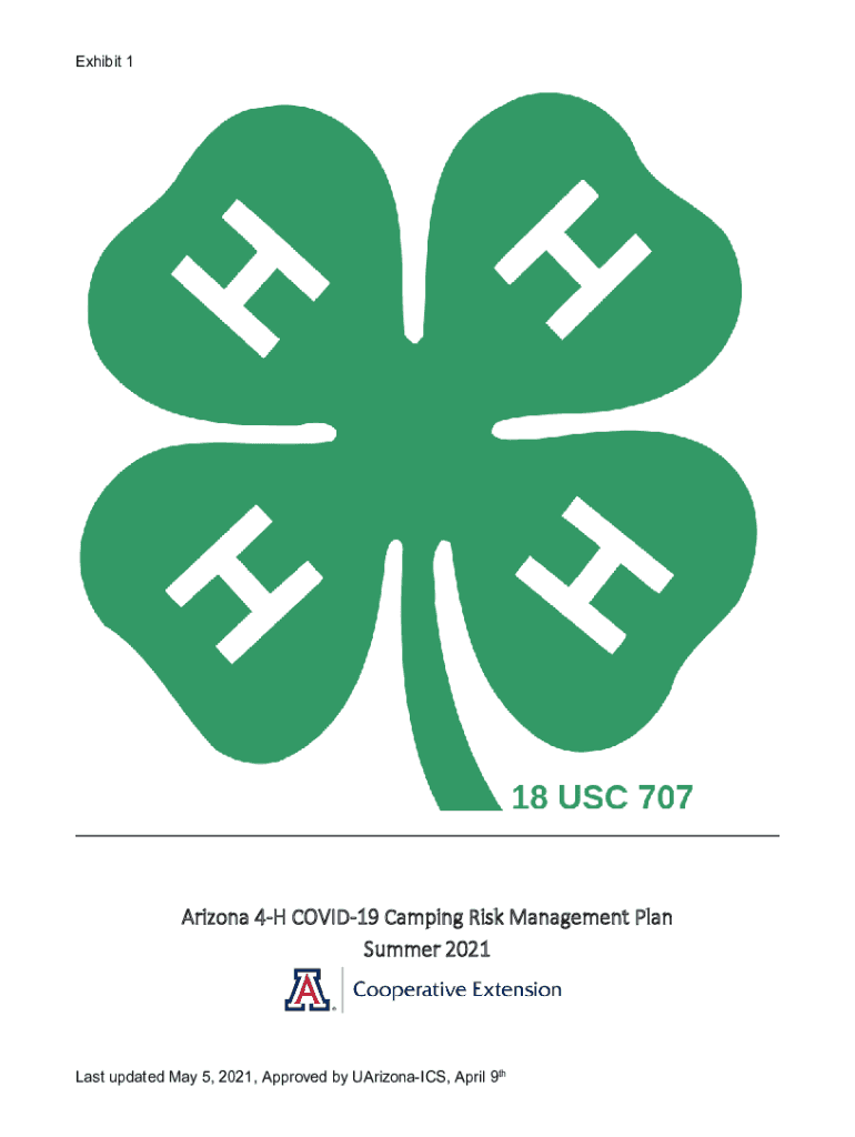 Exhibit 1Arizona 4H COVID-19 Camping Risk Management Plan Summer 2021Last updated May 5, 2021, Approved by Arizonans, April 9thIntroduction The goal of this document is to outline the policies and