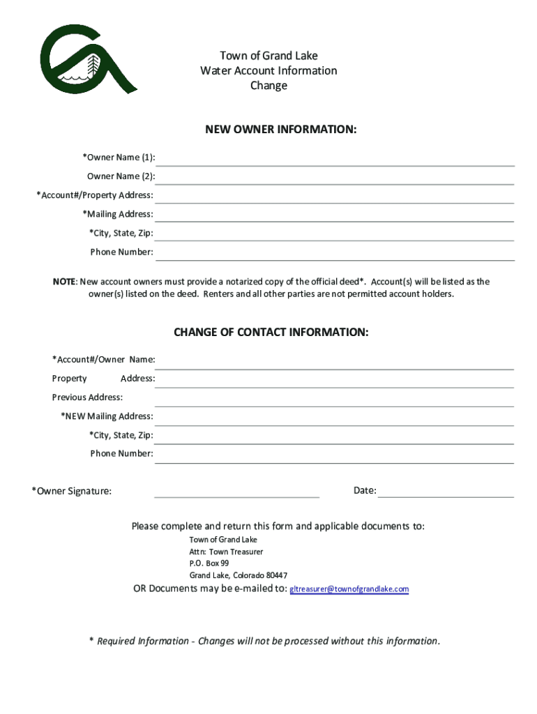 Town of Grand Lake Water Account Information Change NEW OWNER INFORMATION: *Owner Name (1): Owner Name (2): *Account#/Property Address: *Mailing Address: *City, State, Zip: Phone Number: NOTE: New