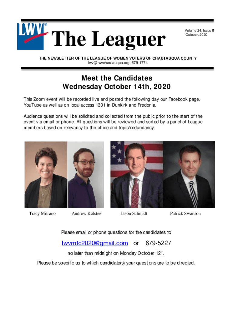 Volume 24, Issue 9 October, 2020The LeaguerTHE NEWSLETTER OF THE LEAGUE OF WOMEN VOTERS OF CHAUTAUQUA COUNTY lwv@lwvchautauqua.org, 6791774Meet the Candidates Wednesday, October 14th, 2020 This Zoom