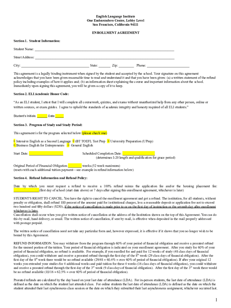 English Language Institute One Embarcadero Center, Lobby Level San Francisco, California 94111 ENROLLMENT AGREEMENT Section 1. Student Information: Student Name: ___ Street Address: ___ City: ___