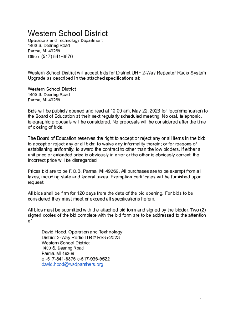 Western School District Operations and Technology Department 1400 S. Wearing Road Parma, MI 49269 Office (517) 8418876 ___ Western School District will accept bids for District UHF 2Way Repeater Radio
