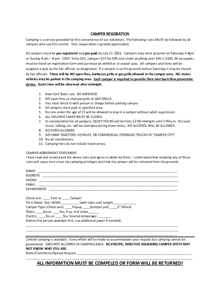 CAMPER REGISTRATION Camping is a service provided for the convenience of our exhibitors. The following rules MUST be followed by all campers who use this service. Your cooperation is greatly appreciated.