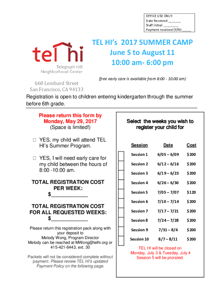 OFFICE USE ONLY: Date Received:___ Staff Initial: ___ Payment received (Y/N):___TEL HI's 2017 SUMMER CAMP June 5 to August 11 10:00 am 6:00 pm (free early care is available from 8:00 10:00 am)660