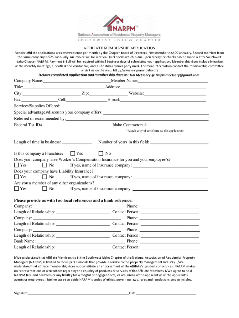 AFFILIATE MEMBERSHIP APPLICATION Vendor affiliate applications are reviewed once per month by the Chapter Board of Directors. First member is $500 annually. Second member from the same company is