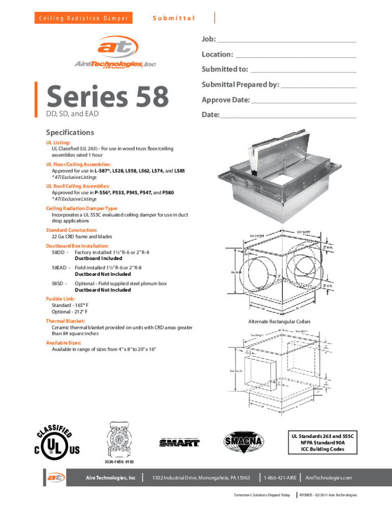 Ceiling Radiation DamperSubmittalJob:___ Location:___ Submitted to:___Series 58 DD, SD, and Submittal Prepared by:___ Approve Date:___ Date:___Specifications UL Listing: UL Classified (UL 263) For