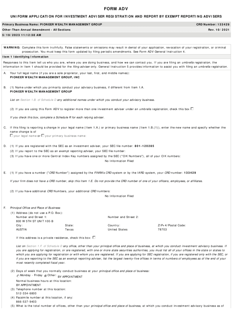 FORM ADV UNIFORM APPLICATION FOR INVESTMENT ADVISER REGISTRATION AND REPORT BY EXEMPT REPORTING ADVISERS Primary Business Name: PIONEER WEALTH MANAGEMENT GROUP CRD Number: 133429OtherThanAnnual Amendment