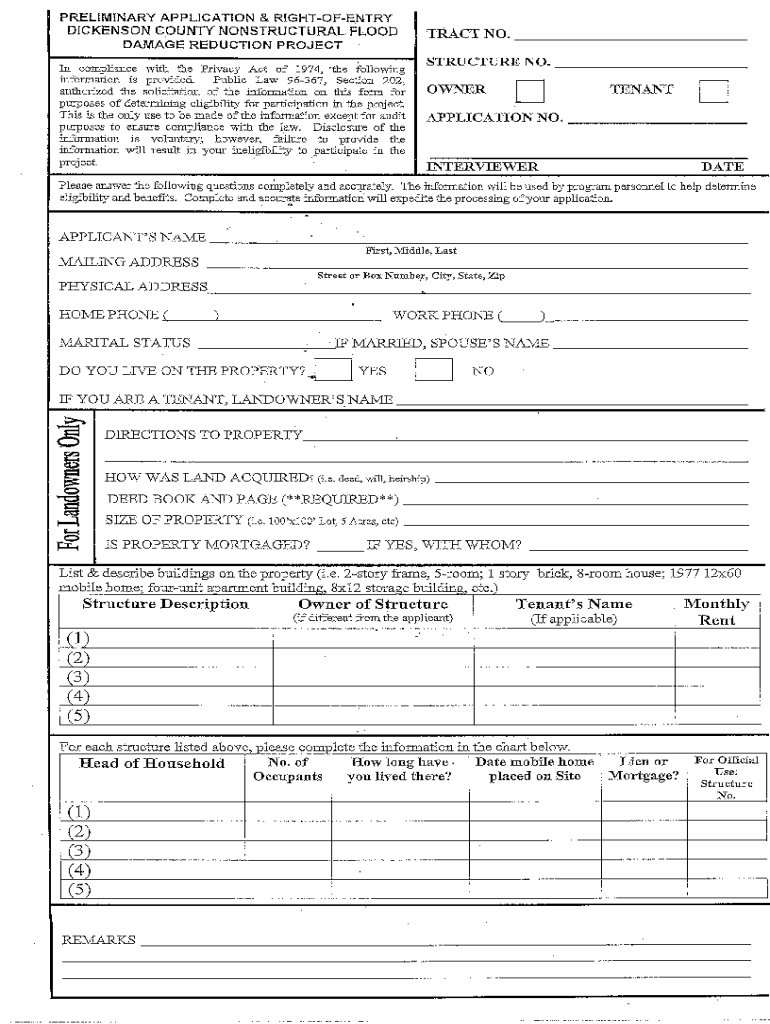PRELIMINARY APPLICATION & RIGHTOFENTRYDlCKENSON COUNTY NONSTRUCTURAL FLOODTRACTNO.DAMAGE REDUCTION PROJECTSTRUCTURE NO. In compliance with the Privacy Act of 1974, the following