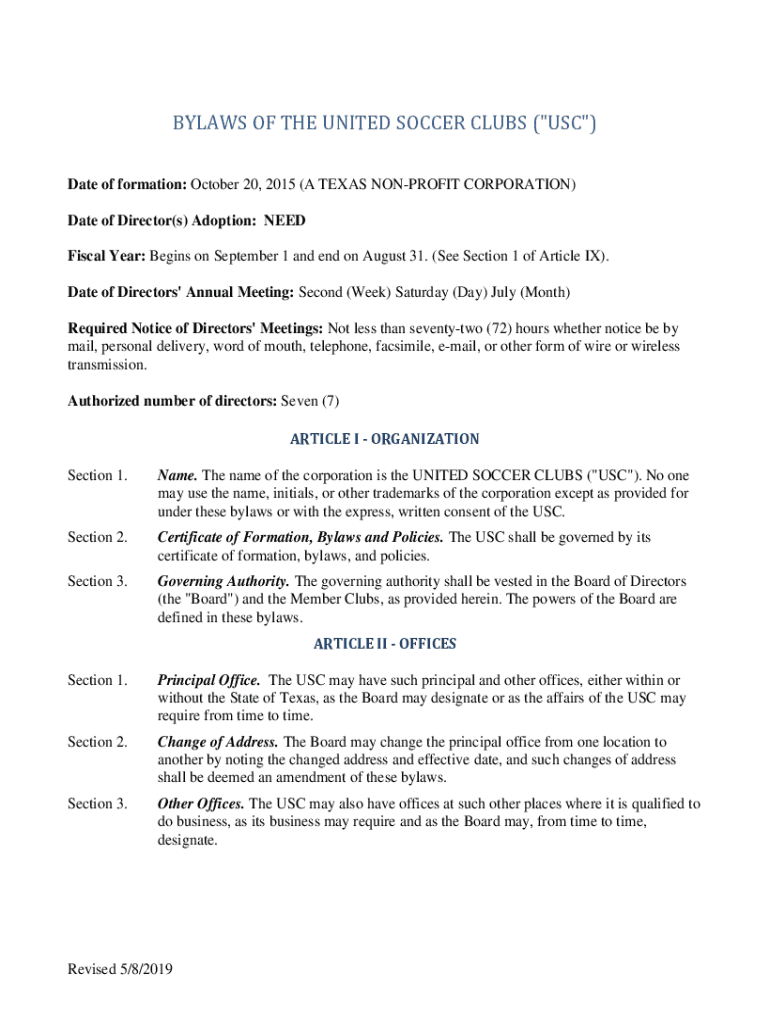 BYLAWS OF THE UNITED SOCCER CLUBS (\” USC\”) Date of formation: October 20, 2015 (A TEXAS NONPROFIT CORPORATION) Date of Director(s) Adoption: NEED Fiscal Year: Begins on September 1 and end on
