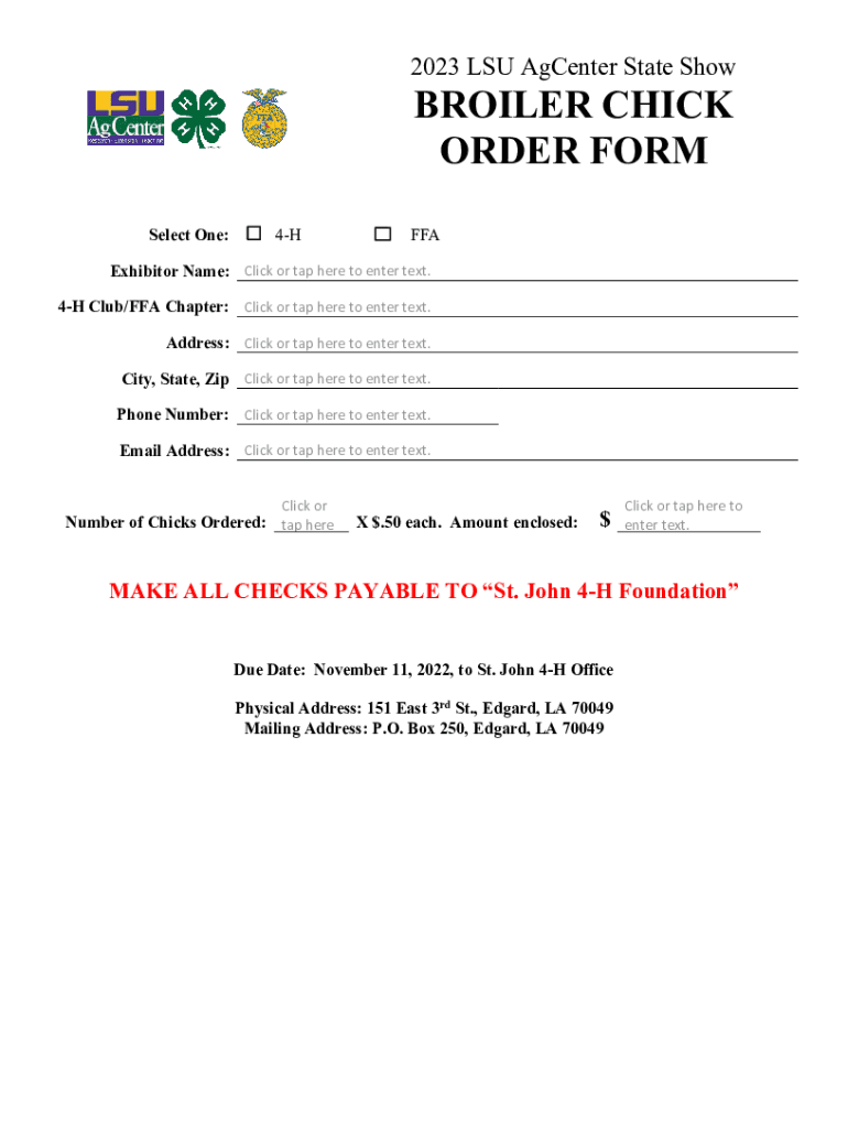 2023 LSU Center State ShowBROILER CHICK ORDER FORMS elect One: 4HFFAExhibitor Name: Click or tap here to enter text. 4H Club/FFA Chapter: Click or tap here to enter text. Address: Click or tap here