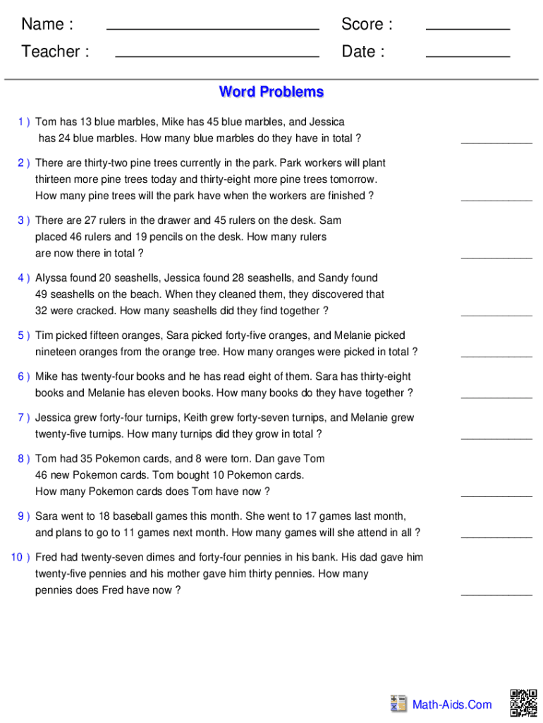Name :Score :Teacher :Date : Word Problems1) Tom has 13 blue marbles, Mike has 45 blue marbles, and Jessica has 24 blue marbles. How many blue marbles do they have in total ?___2) There are thirty-two