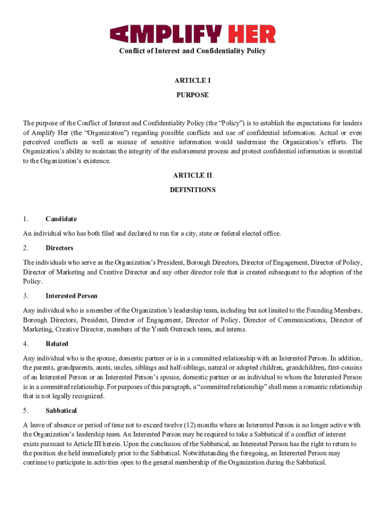 Conflict of Interest and Confidentiality PolicyARTICLE I Purpose of the Conflict of Interest and Confidentiality Policy (the Policy) is to establish the expectations for leaders of Amplify Her (the