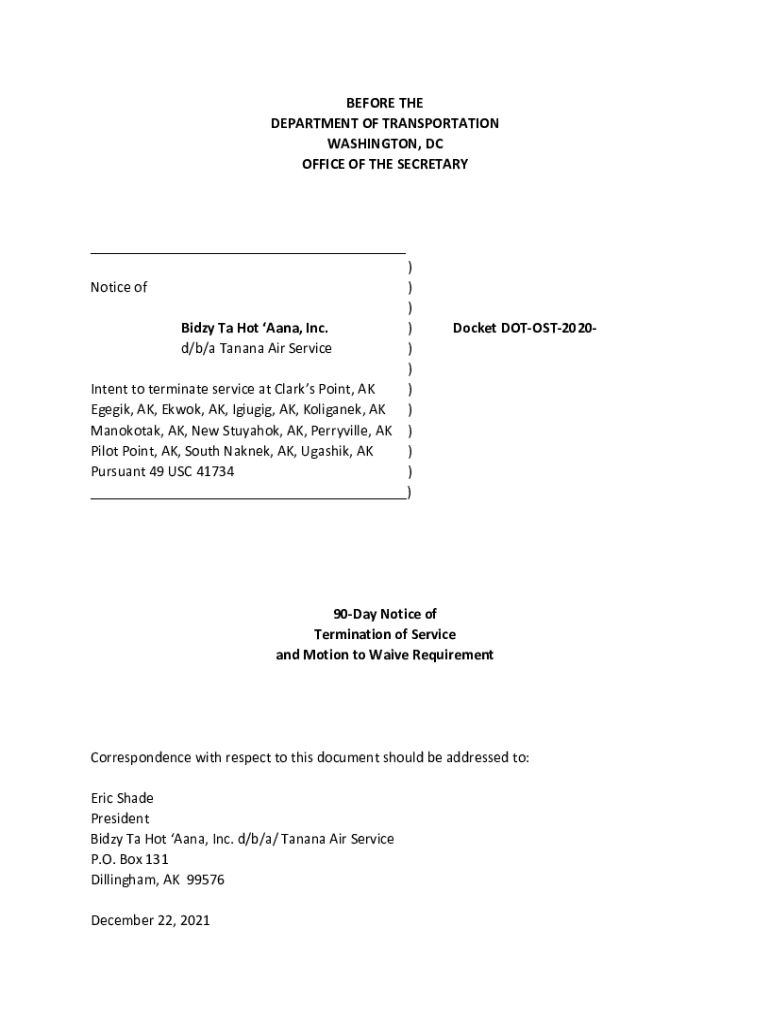 BEFORE THE DEPARTMENT OF TRANSPORTATION WASHINGTON, DC OFFICE OF THE SECRETARY___) Notice of)) Biddy Ta Hot Anna, Inc.) d/b/a Banana Air Service)) Intent to terminate service at Clark's Point, AK)
