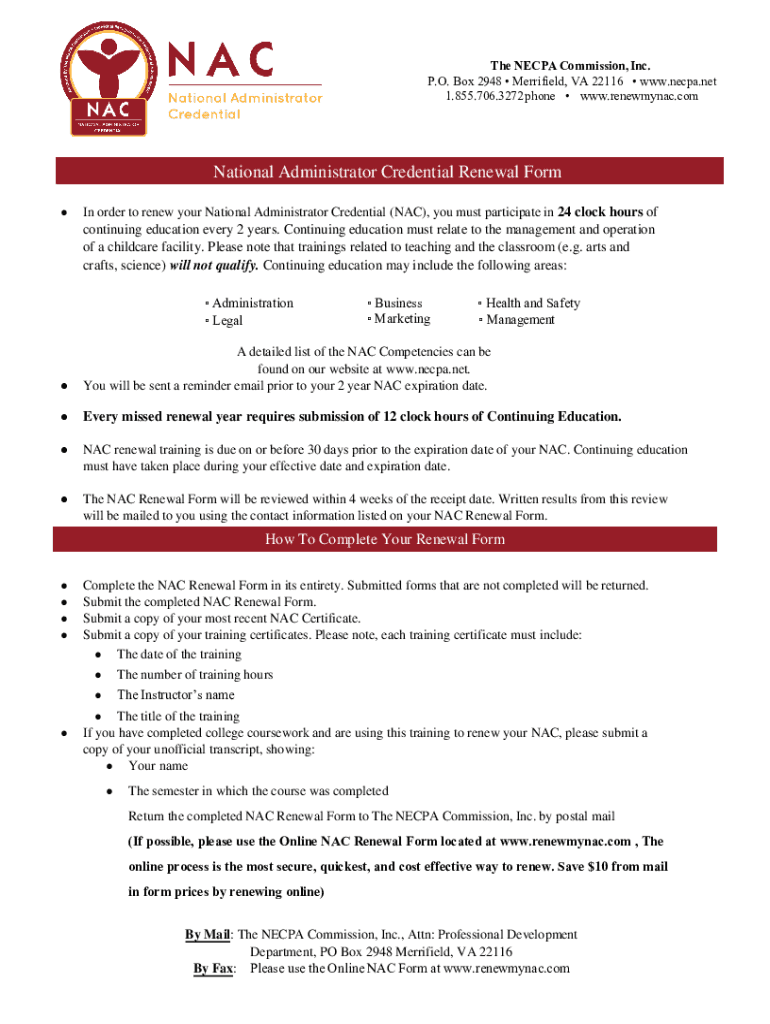 The NE CPA Commission, Inc. P.O. Box 2948 Terrified, VA 22116 www.necpa.net 1.855.706.3272 phone www.renewmynac.comNational Administrator Credential Renewal Form In order to renew your National Administrator