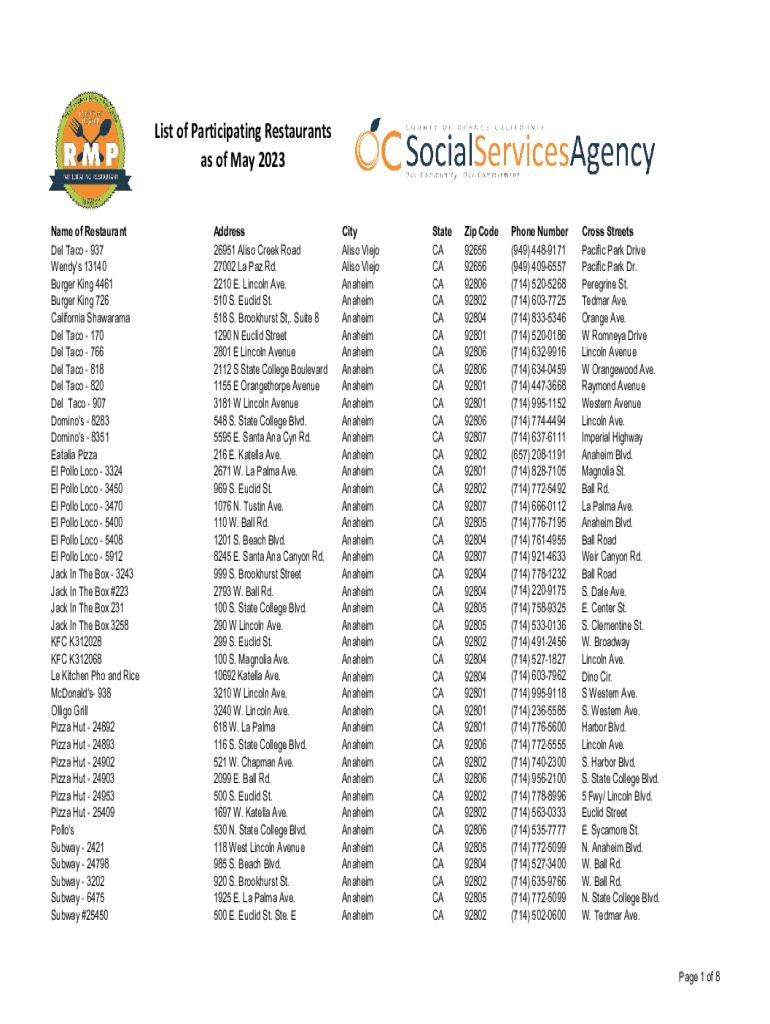 List of Participating Restaurants as of May 2023 Name of Restaurant Del Taco 937 Wendy\'s 13140 Burger King 4461 Burger King 726 California Shawarma Del Taco 170 Del Taco 766 Del Taco 818 Del Taco