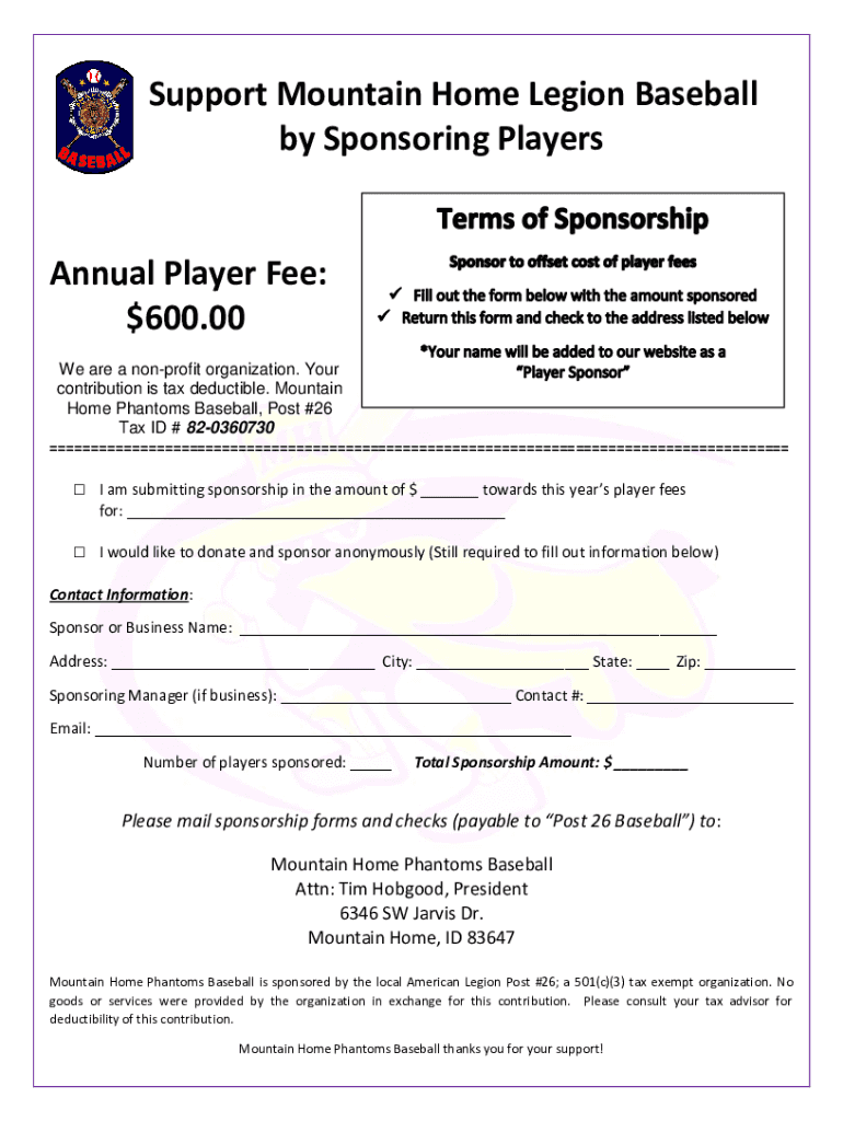 Support Mountain Home Legion Baseball by Sponsoring PlayersAnnual Player Fee: $600.00 We are a nonprofit organization. Your contribution is tax-deductible. Mountain Home Phantoms Baseball, Post #26